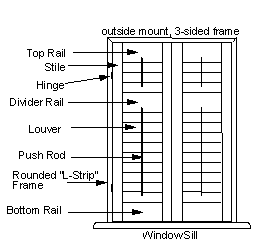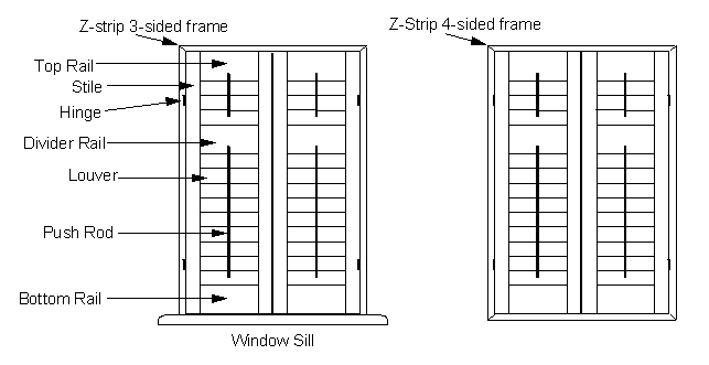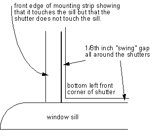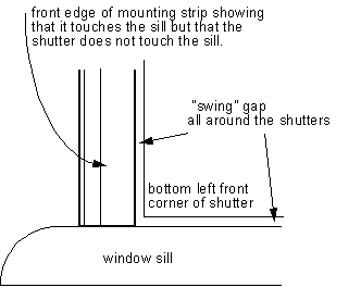 With a 4-sided frame, a bottom mounting strip of Z-strip is attached to the window sill and the shutter swings just above it. The effect is as if the shutter panels were completely surrounded by a "picture frame" made of Z-strip. In this case all the ends of all the mounting strips will be miter cut (45 degrees).