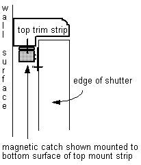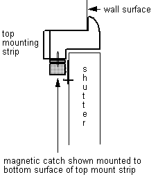 9. The magnets will be mounted at the top immediately behind the shutter panels on the edge of the top mounting strip that faces down. With the left shutter panel open on it's hinges, position a magnetic catch immediately behind the "stile" of the right panel. Using the 2 matching screws provided, attach the magnet to the trim. Magnetically stick the strike plate to the magnet with the 2 tiny "points" facing the room, then gently press the shutter panel against the strike plate to make marks in the wood of the shutter "stile". Using those marks as your placement guide, attach the strike plate to the back of the "stile" with the smallest screw provided (see figure below, left). Using the same procedure, attach any other magnetic catches that are appropriate to your installation. If you prefer, the magnets can be mounted to the sill, or to the bottom strip of a 4-sided frame.