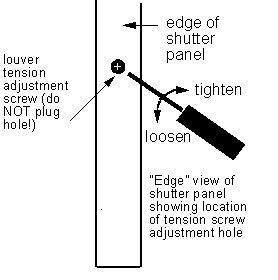 11. All shutter panels come with "tension" screws deeply counter-sunk in each vertical edge. By simply turning the screw a little clockwise or counter-clockwise with your Phillips head screw driver, you can gently tighten or loosen the louver/pushrod tension in each individual panel to suit your preferences. When adjusting the tension, always spread the amount of adjustment evenly between all screws in BOTH edges of the individual panel (see figure above, right).