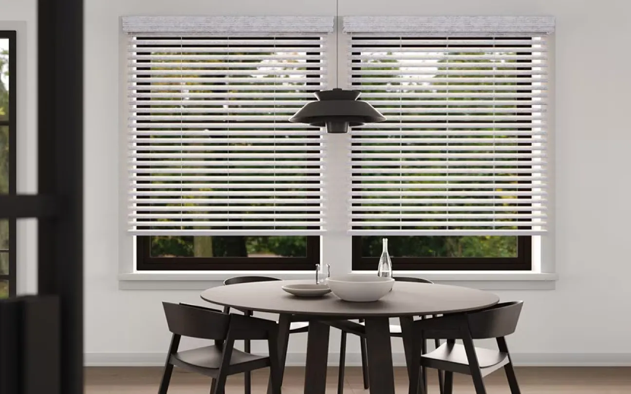 Get the stylish look of real wood without the high price tag with durable faux wood blinds! These blinds are cordless for added child safety, and they won’t warp or peel, making them a great choice for any room—whether it’s your kitchen, bathroom or even the garage, where moisture is often a concern.