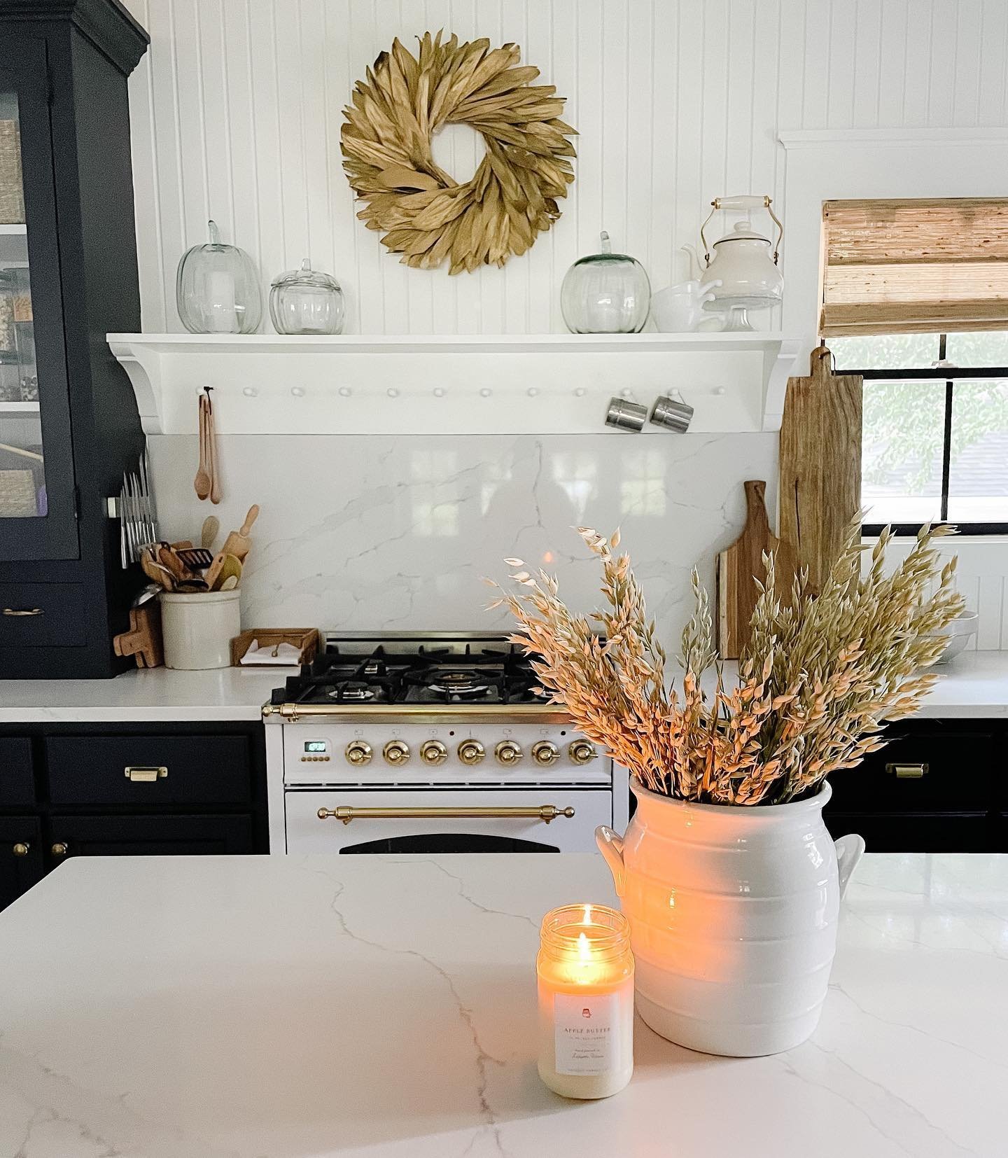 A simple way of shifting from summer to fall decor is by adding a wreath. Try placing it in the kitchen above the stove and adding glass pumpkins that double as candle holders for a chic fall look. If traditional orange and brown wreaths aren't your style, put a modern spin on them by choosing one in a gold or copper shade.
