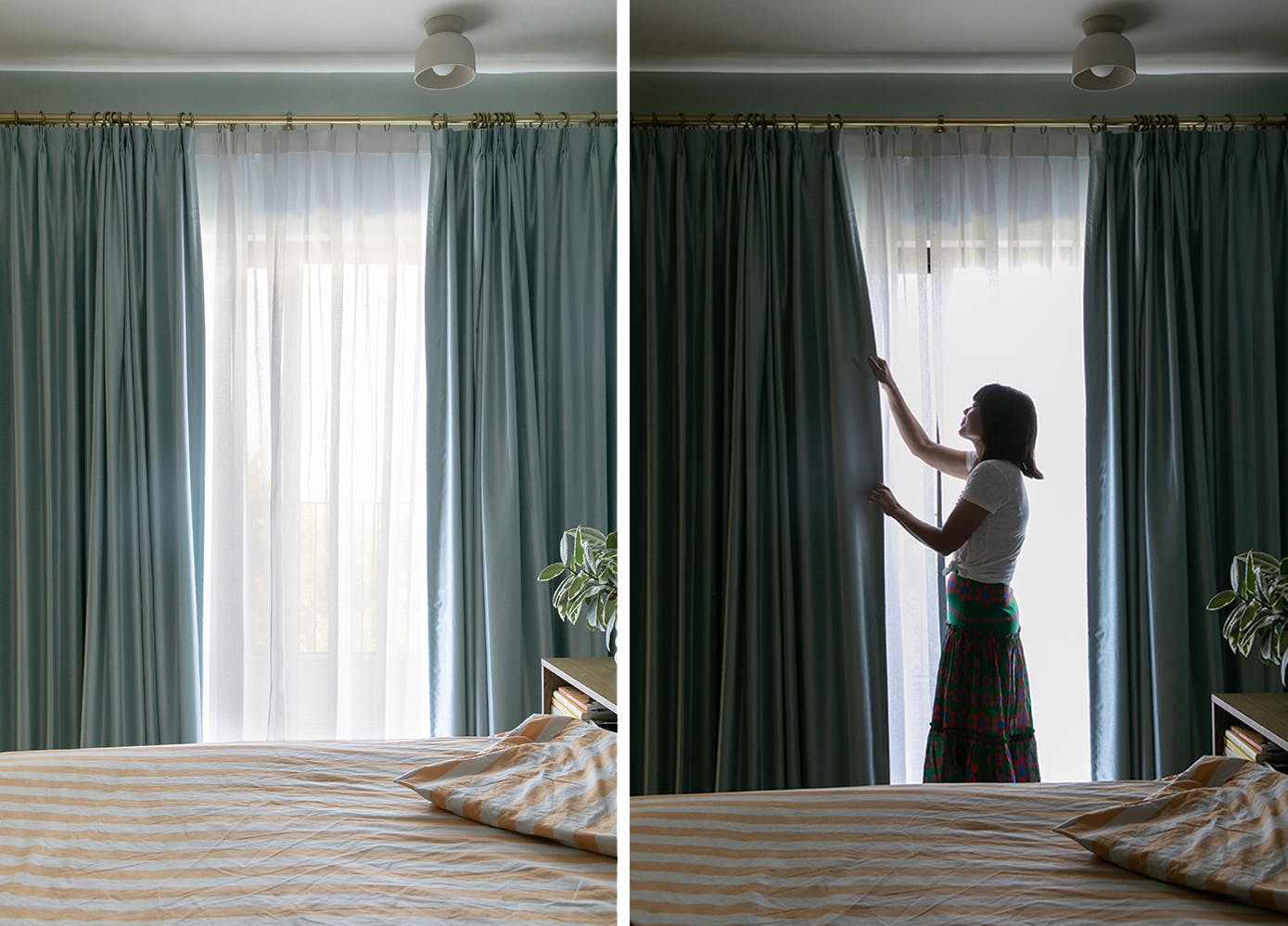 Joy wanted a bit more drama for the main bedroom's floor-to-ceiling windows, so she layered two sets of voluminous draperies.