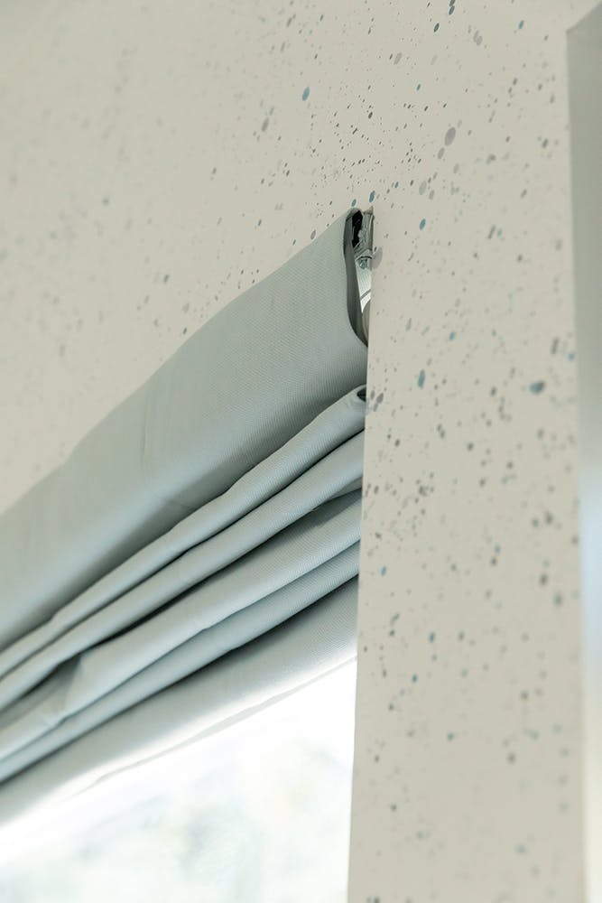 For the wide windows in her daughters' colorful bedroom, Joy used blackout Premium Roman Shades again, but this time in a soft grey called Luxe Velvet Branch.