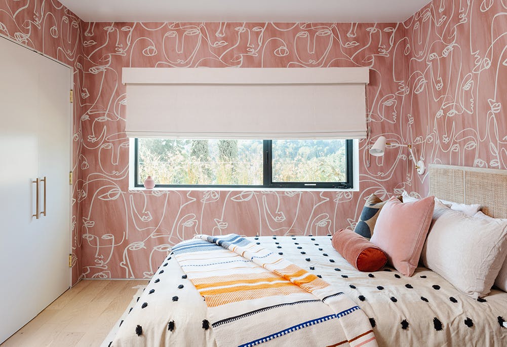 When choosing window treatments for the guest bedroom, Joy wanted shades that contrasted with the graphic wallpaper and blocked light so guests could sleep in soundly.