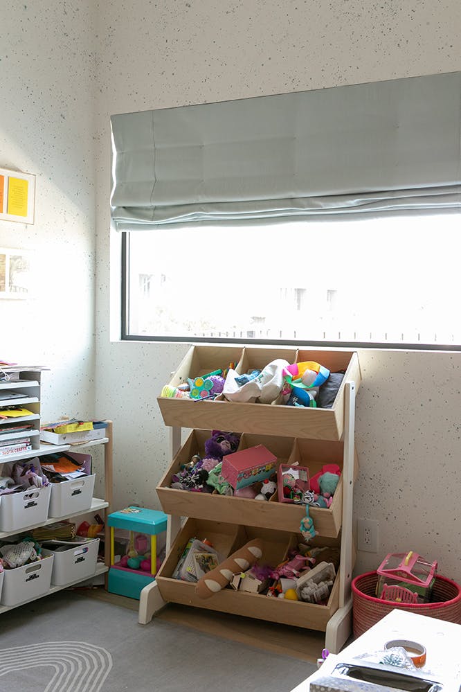 Play Room: Roman Shades in Sorrento Mica with blackout liner and motorized lift.