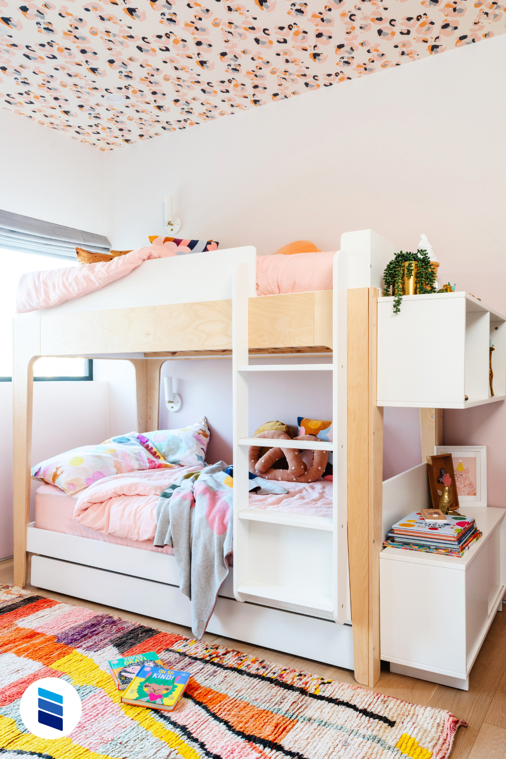 OhJoy's daughters' bedroom is everything we wanted and more as a kid. Bunk beds, soft, pastel pink sheets, and a to-die-for colorful rug. To balance the busy prints, Joy chose a subtle grey Classic Roman Shade. See more of OhJoy's home makeover.