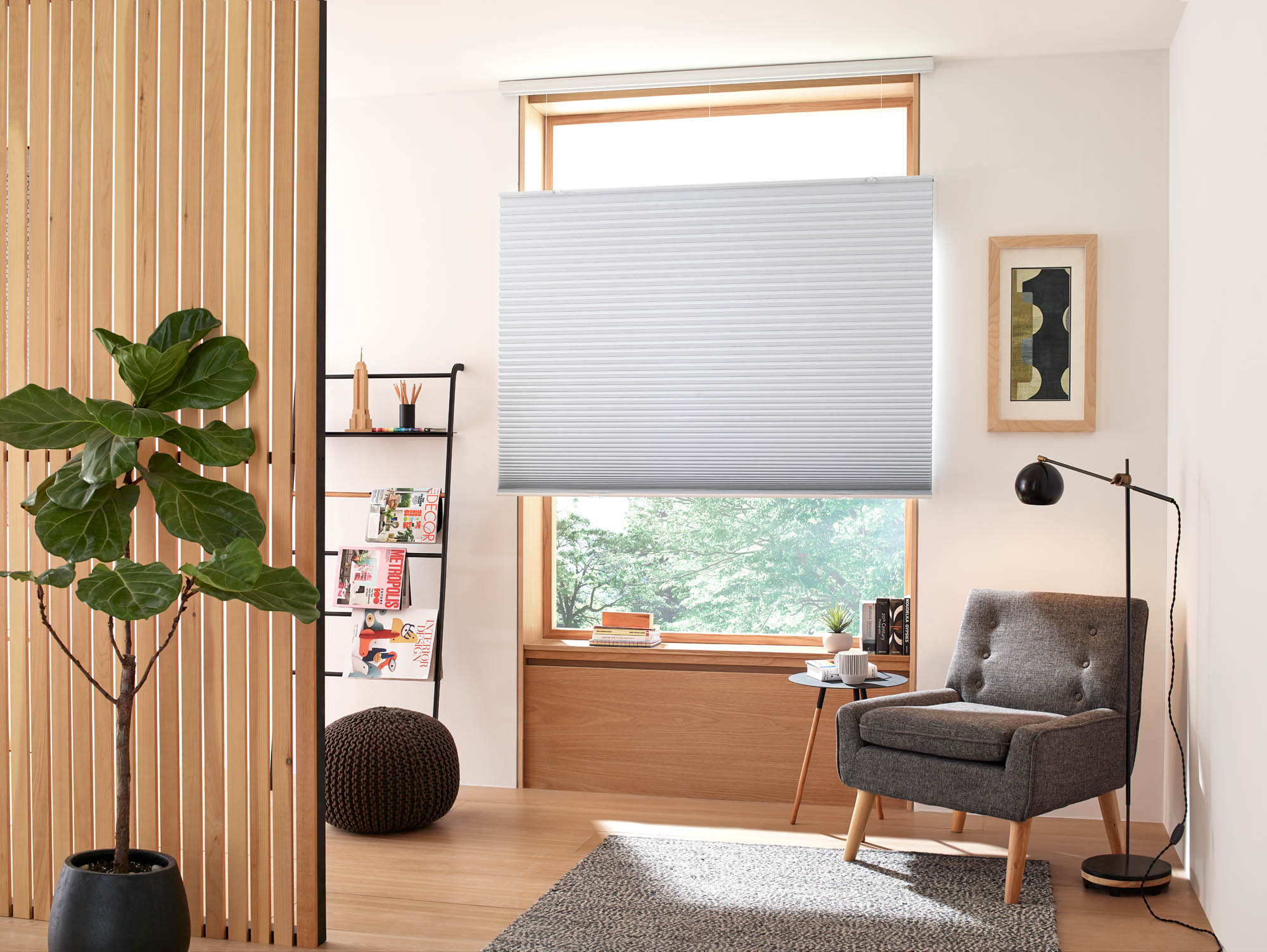 A modern living room with Blinds.com Premium Blackout Cellular Shades
