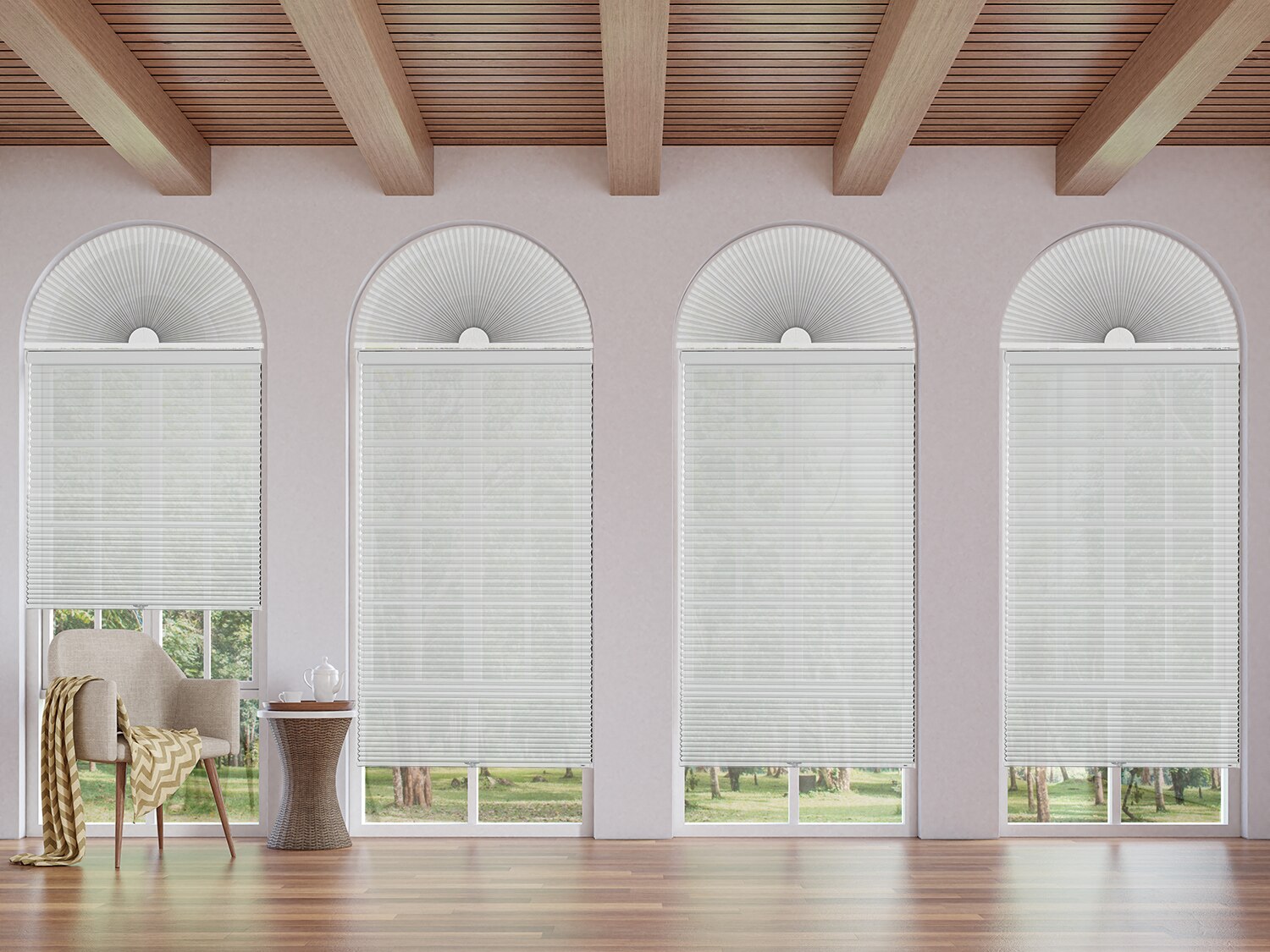 These arches feature a honeycomb interior that serves as a barrier between extreme outdoor temperatures and the comfortable temperature of your home. Light Filtering Cellular Arches are excellent at providing privacy while allowing gently filtered light into your room. They are available in single and double cell thicknesses, as well as a lovely palette of fashion-forward colors These arches will ensure that your windows are as beautiful as they are energy-efficient.
