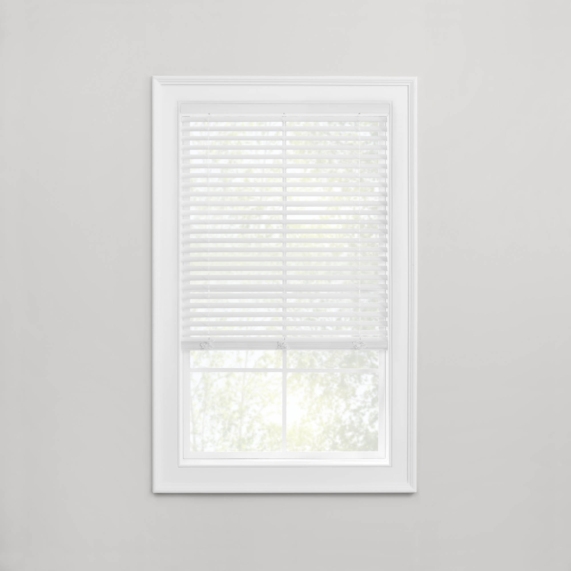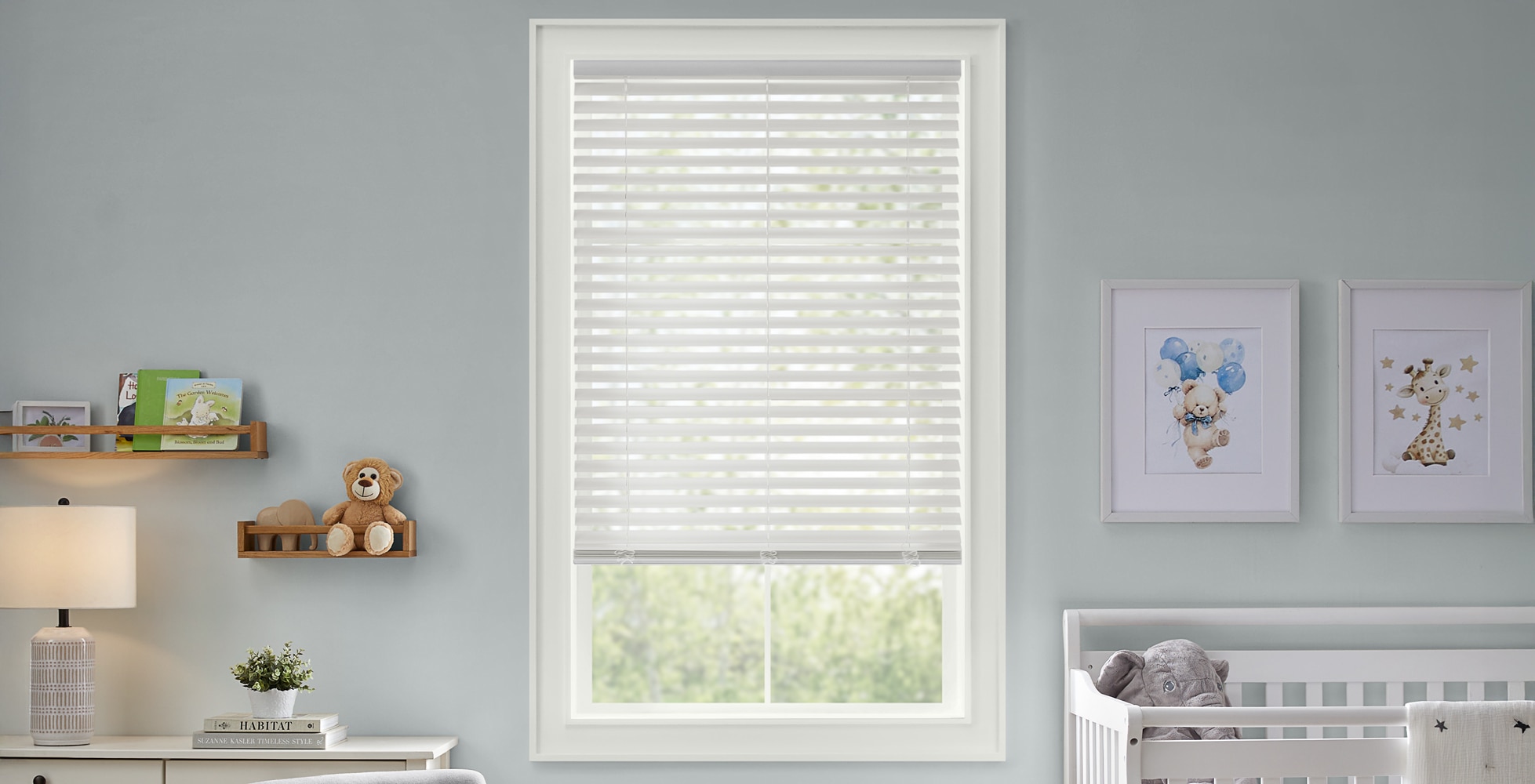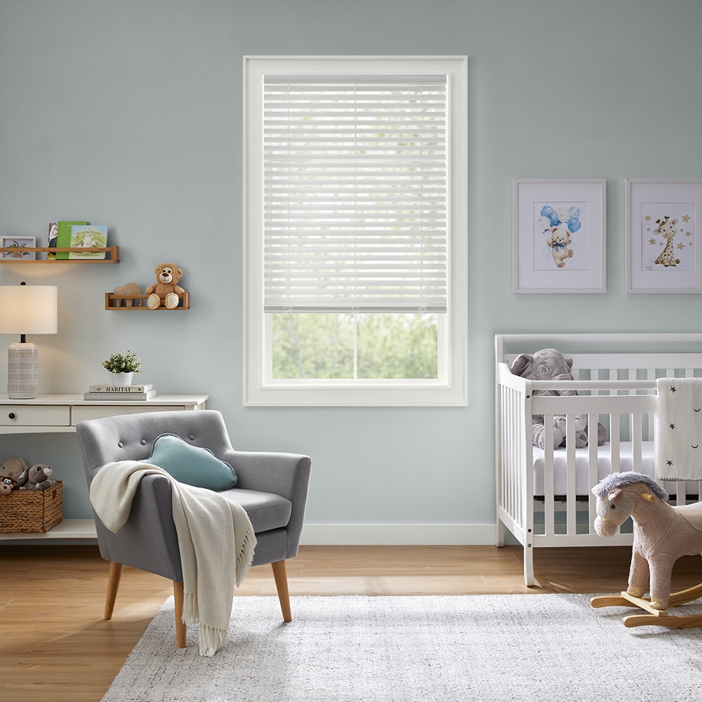 Modern, clean, and super easy to operate, the Blinds.com Cordless S-Curve 2 inch Faux Wood Vinyl Blinds are also safer for kids and pets. These blinds give any room the look of a contemporary white 2" wood or faux wood blind with a true worry-free operating system.