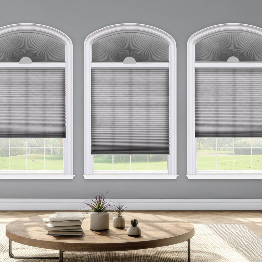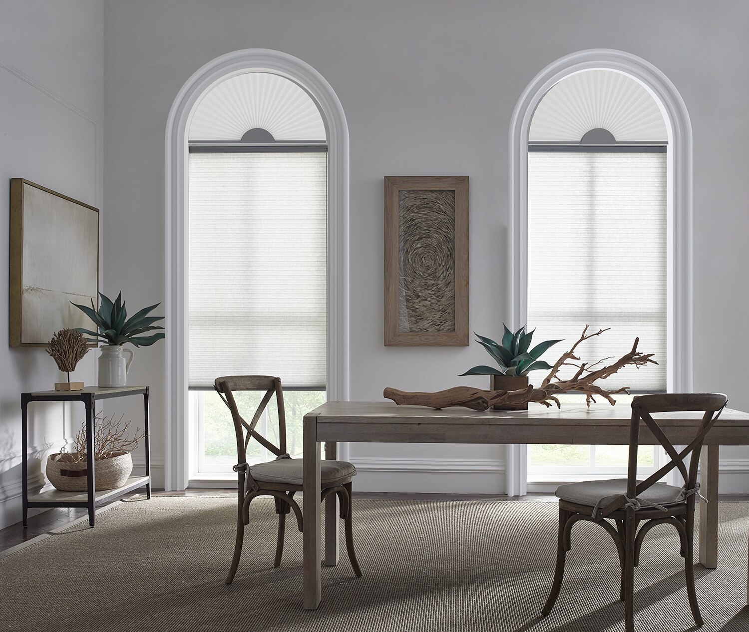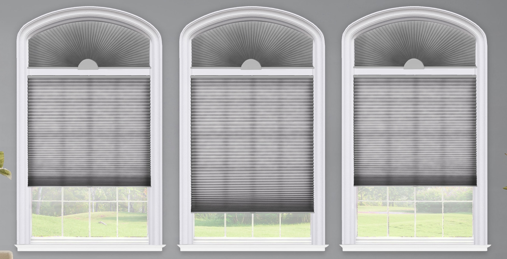 Blinds.com Light Filtering Cellular Arches feature a Perfect Arch, Eyebrow Arch, or Elongated Arch . Like their sister product, Blackout Cellular Shades, these arches are constructed with an insulating honeycomb core and are available in an impressive assortment of textured solids and subtle prints.
