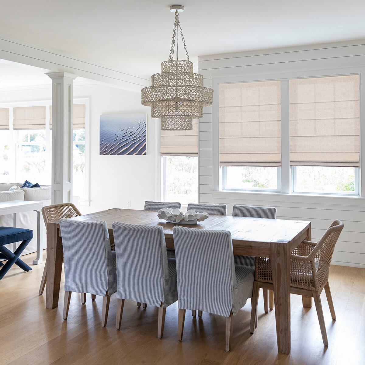 Elevate your windows with Blinds.com Luxury Roman Shades—where timeless elegance meets today’s innovation. Create your perfect look by choosing from designer styles like Flat, Hobbled , Knife Pleated, or Front Slat , and pick from a curated selection of premium fabrics, including sophisticated textures and chic jacquards. Transform your space with shades that are as beautiful as they are functional. Tailor your privacy and light with light-filtering or blackout liners in White or Ivory. Enjoy safe, tangle-free cordless operation, or opt for continuous cord loop or advanced motorization , including smart home integration with leading technologies. Easy installation means your shades are ready in just 15–20 minutes.