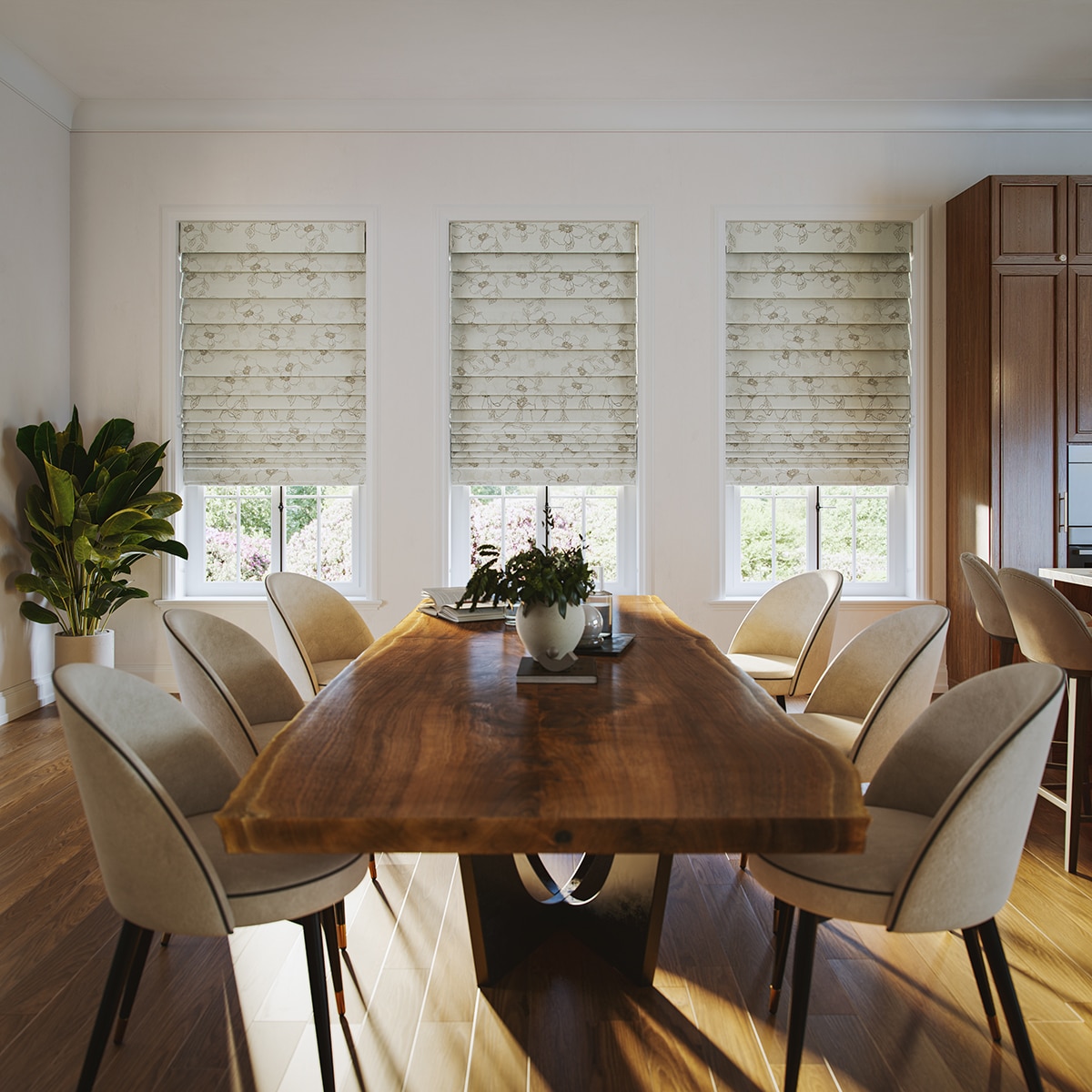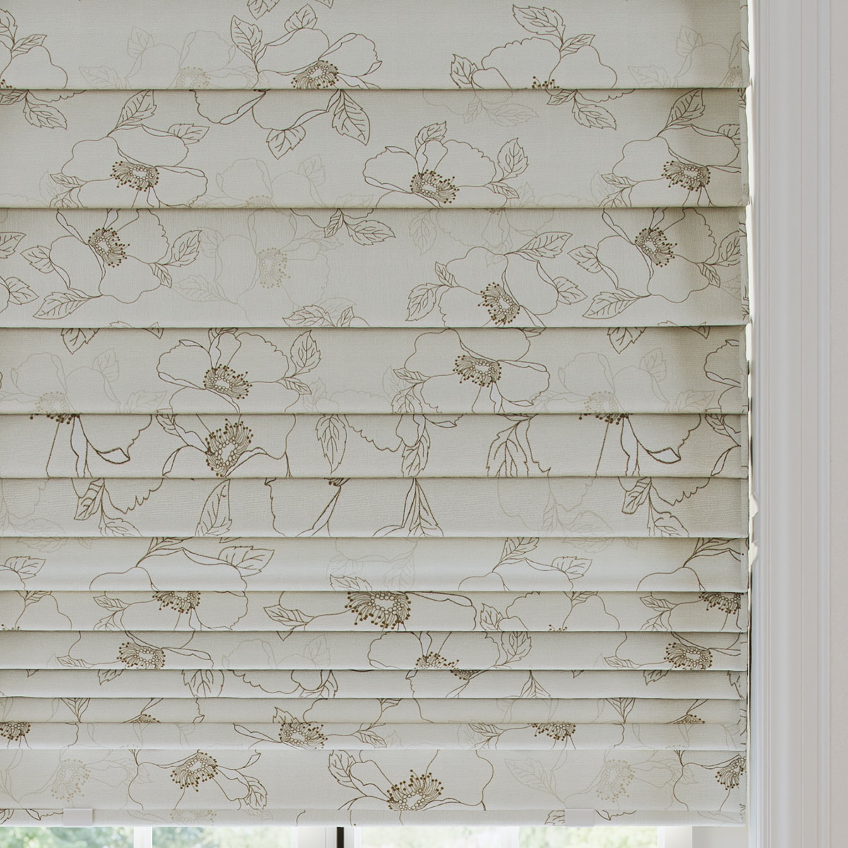 Blinds.com No Drill Roman Shades offer an optimal combination of affordability, classic design, and straightforward installation. Available in a wide selection of textures, colors, and patterns, these shades are designed to enhance any interior decor. The cordless lift system ensures seamless and smooth operation. Our shades are equipped with a neutral-backed liner, ensuring a consistent and sophisticated exterior appearance. They are available with a valance and your choice of classic or soft fold styles to suit various design preferences.