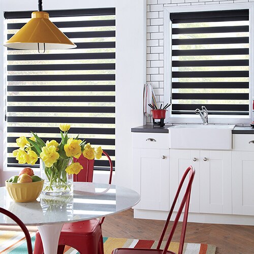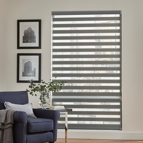 Blinds.com’s Premium Flat Sheer Shades give your window a soft sophisticated appearance of a shade with the complete light control of blind. Shades feature a distinct design consisting of 2 layers of flat fabric with alternating solid and sheer panels that can be adjusted to filter or dim sunlight from entering your window. Raise the shade completely into the cassette headrail for a clear unobstructed view to the outside. Cassette headrail will arrive with matching fabric insert for a complete look.