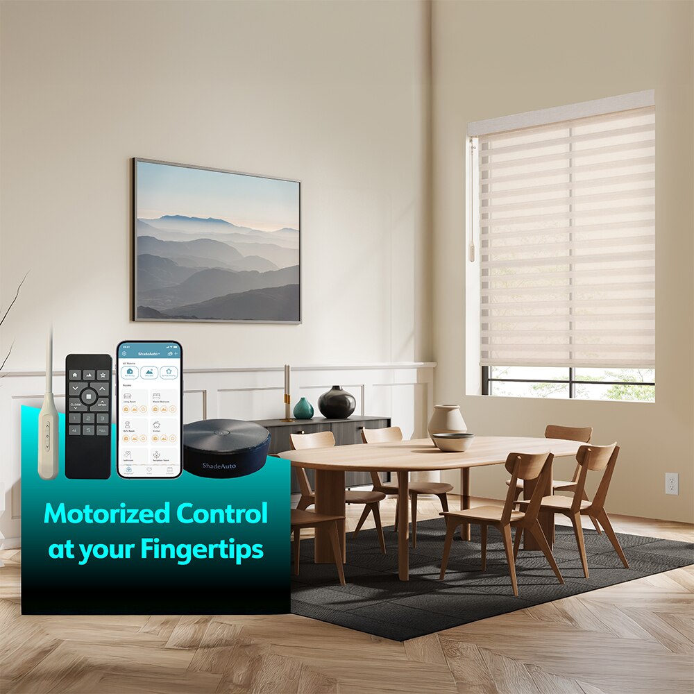 This shade's innovative design combines the variable views of a banded shade with the light control of a sheer shade allowing total versatility. Choose from a stunning array of solid and sheer light filtering fabric combinations to enjoy the sunlight's natural glow without the harsh glare. Our dedication to quality is also demonstrated with 100% woven seams and a smooth, high-end finish on all fabric choices for modern looks with a softness that adds intrigue and warmth.