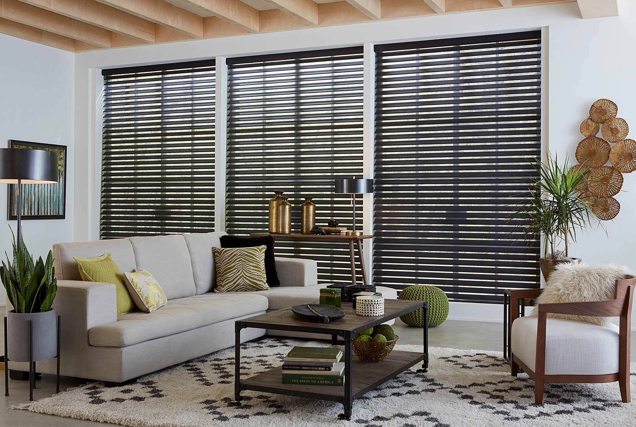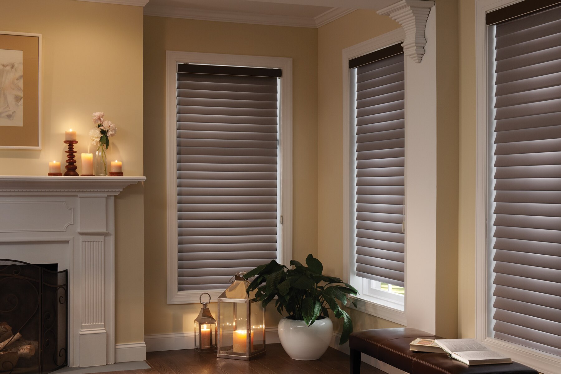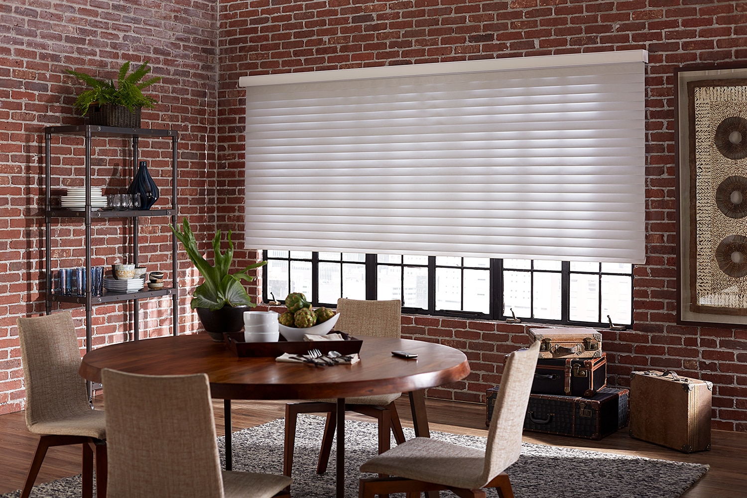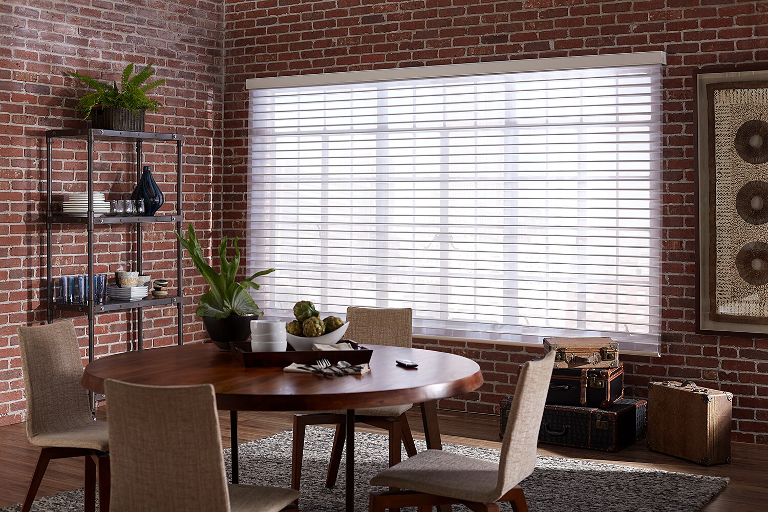Blinds.com’s Radiance Room Darkening Sheer Shades give your windows a luminous glow in addition to complete privacy. Similar to blinds, these window shadings feature soft, translucent fabric vanes suspended between two sheer layers of fabric. When lowered, the vanes may be tilted at any angle—from fully open to fully closed. Available in an array of linen solids and “casually chic” textures, these room-darkening shades offer both seclusion and luxury. When the shades are raised, the fabric is concealed within the headrail, and you’re able to see out without any obstruction.