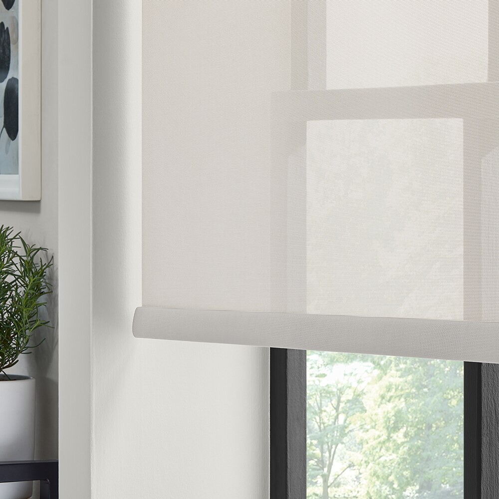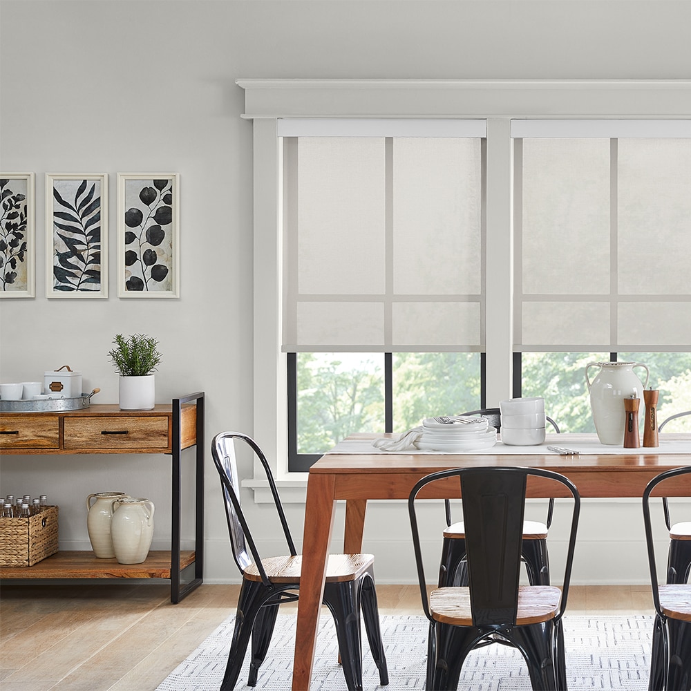 The Blinds.com Solar Shades help filter light, filling your room with warm natural light and reducing glare and harmful UV radiation. This makes them an ideal choice for windows that are often in the path of harsh, direct sunlight but where you want to preserve your windows’ view.
