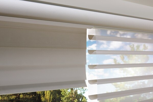 Light Dimming Sheer Shades from Levolor couples soft fabric features with the convenience and functionality of a blind. Delicate fabric vanes are suspended between two layers of transparent cloth which allows the soft slats to be open, closed, or rolled up entirely. When closed, dimming sheer shades provide more privacy and block some sunlight and when fully raised, the shade lifts into a strong metal headrail that will be color coordinated to complement your shade’s color.