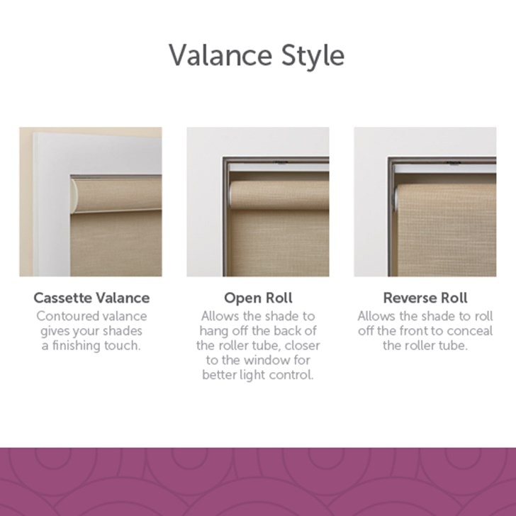- Consider adding a valance to your shade for the perfect finishing touch. Select flat fabric valance or fabric cassette.