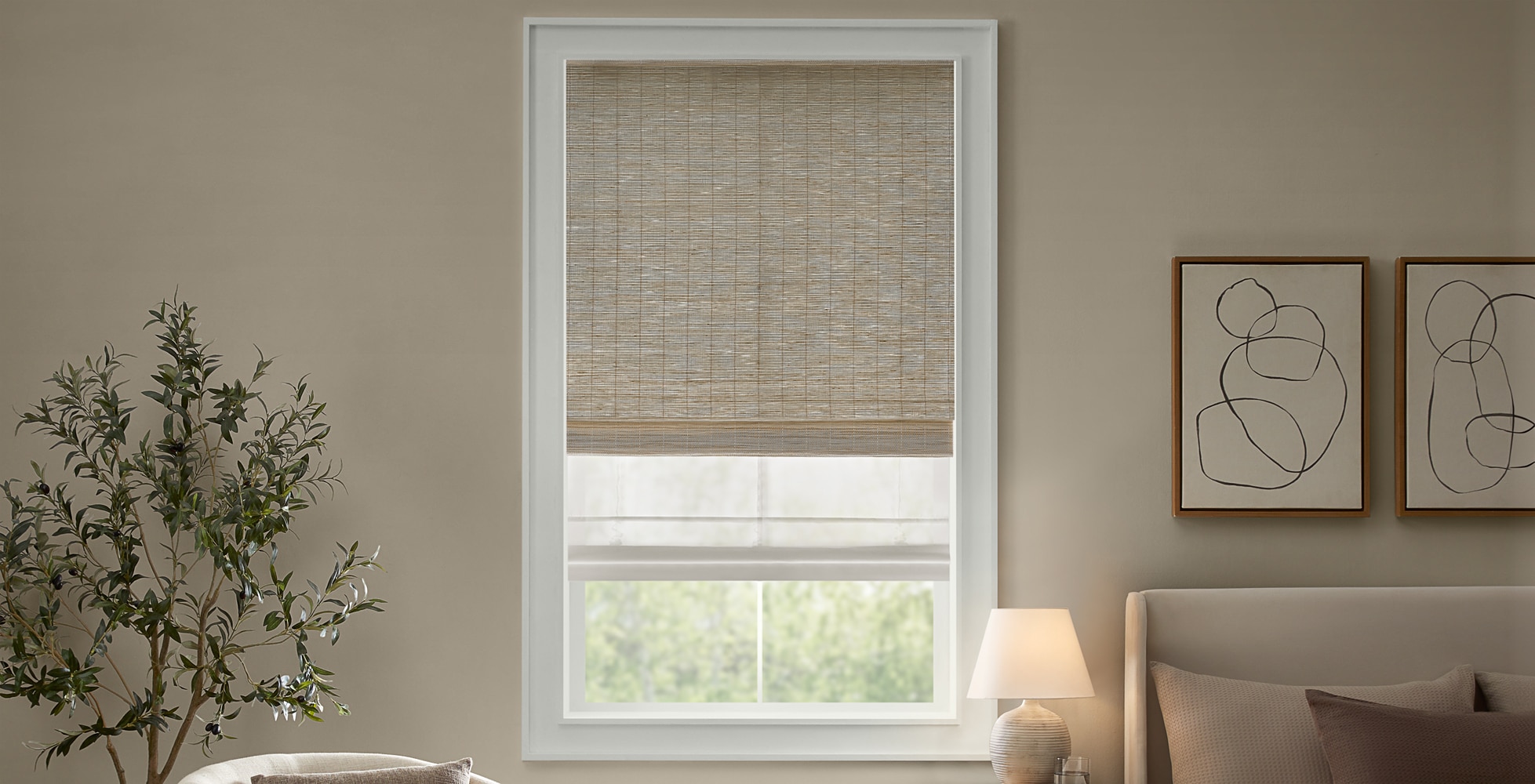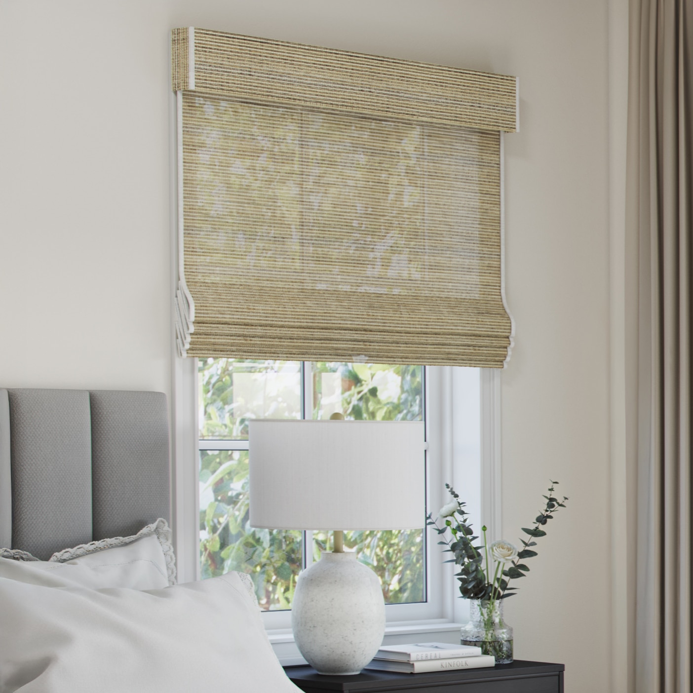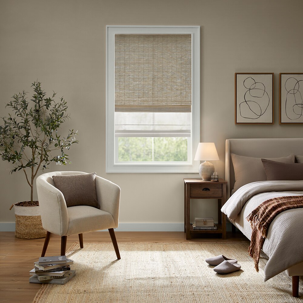 SouthSeas Light Filtering Woven Wood Shades offer a blend of craftsmanship and functionality, made from handwoven natural fibers like jute and kenaf. Available in light-filtering liners, they provide diffused lighting while maintaining privacy. Choose between sleek waterfall or layered decorative valance configurations and enjoy added convenience with cordless or motorized lift options.