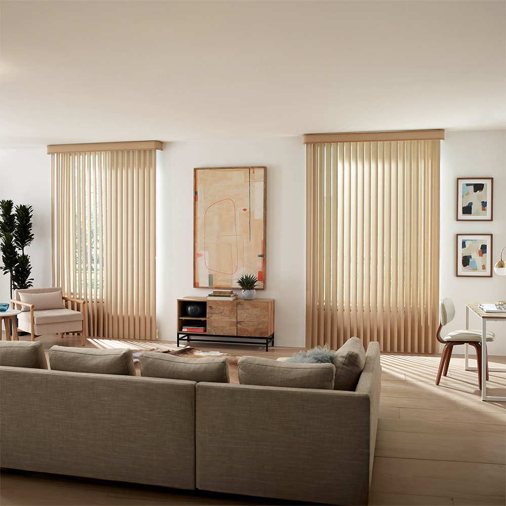 Give your larger windows and sliding glass doors a sophisticated makeover! Unique room-darkening S-Curved Vertical Blinds from SouthSeas offer a stylish and modern take on vertical window solutions. Each durable and easy-to-clean 3.5-inch vane features a slight s-curve that mimics the gentle look of drapery and provides a tighter closure for better privacy. Perfect for large picture windows and walk-through patio doors, these attractive vertical blinds come in a wide range of gentle neutral and stand-out contemporary colors, including smooth and textured finishes. In addition, the SouthSeas S-Curve Vertical Blinds are white on the back to give a uniform look from the street and allow for full coverage on extra-wide patio doors with sizing options up to 102 inches wide.