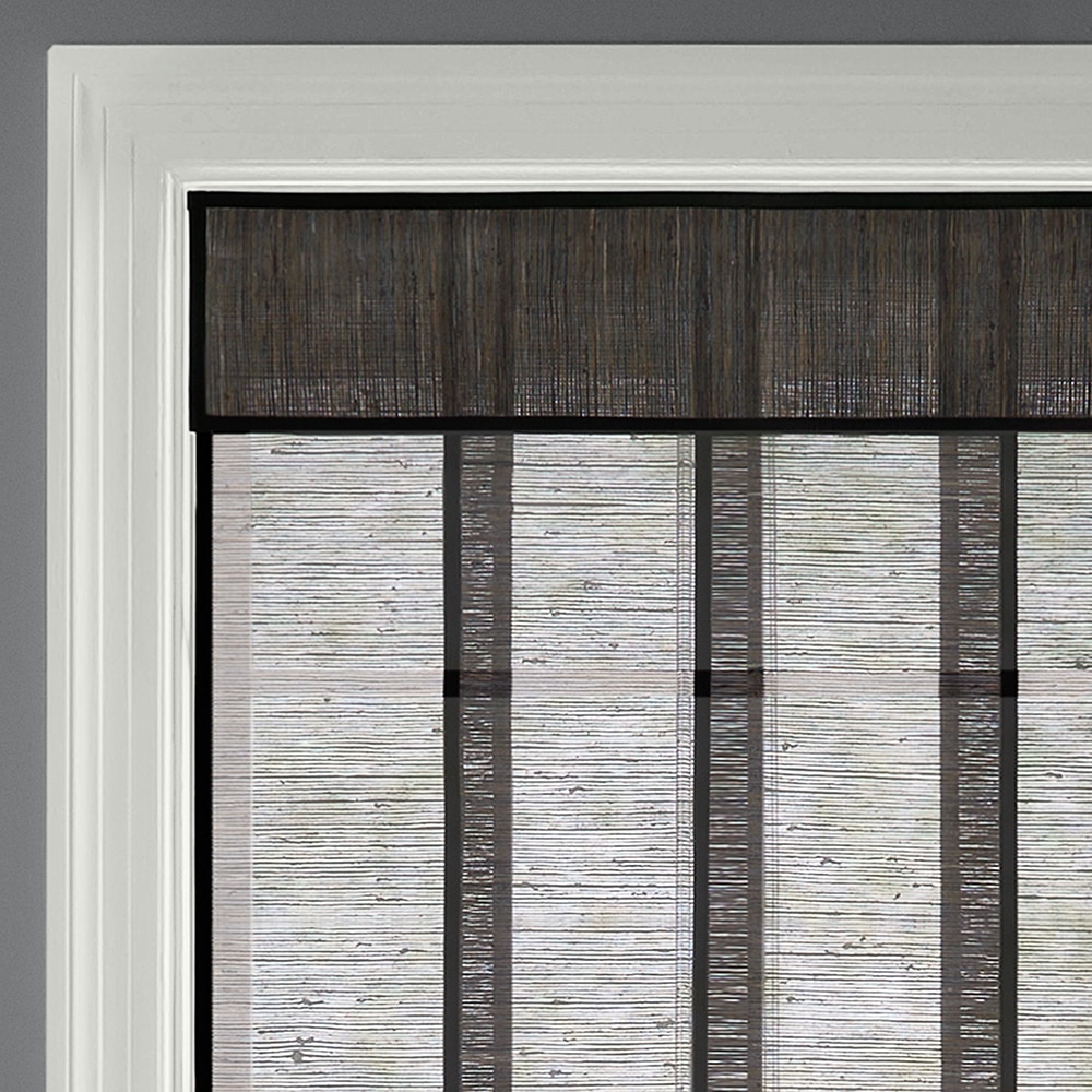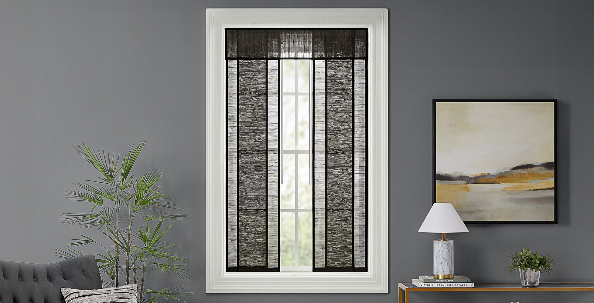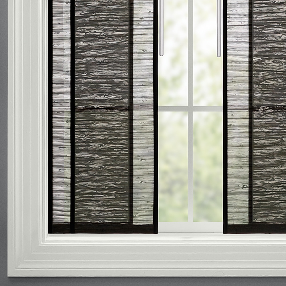 Sliding Panels offer a clean, contemporary look for large windows and doors. Overlapping panels are suspended from hangers, which glide smoothly on an aluminum track and pass in front or behind each other, allowing panels to stack away from the window. Sliding panels can be customized to your window opening with left, right, and center-stacking options available. Left and right-stacking track can be ordered with 3 – 5 panels. Center opening tracks can be ordered with 4 – 8 panels. Sliding Panel patterns are coordinated with the Natural Roman Shade patterns available in the SouthSeas Woven Wood Collection.