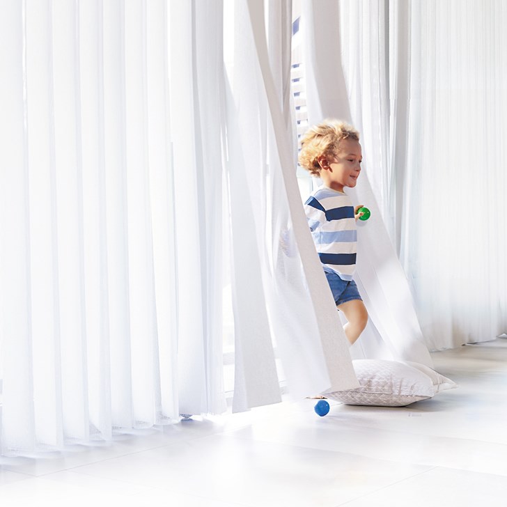 Veneta™ DualDrape Sheer Vertical Blinds pull double duty, providing a home with both the beauty of soft drapery and the functionality of vertical blinds. Whether you need to greet the calming, soft light of the day, or you need to retreat to the privacy of a darkened room, you’ll find you can have either with DualDrape™. The shade transitions between sheer and solid with a turn of the wand and a turn of the vertical fabric vanes.