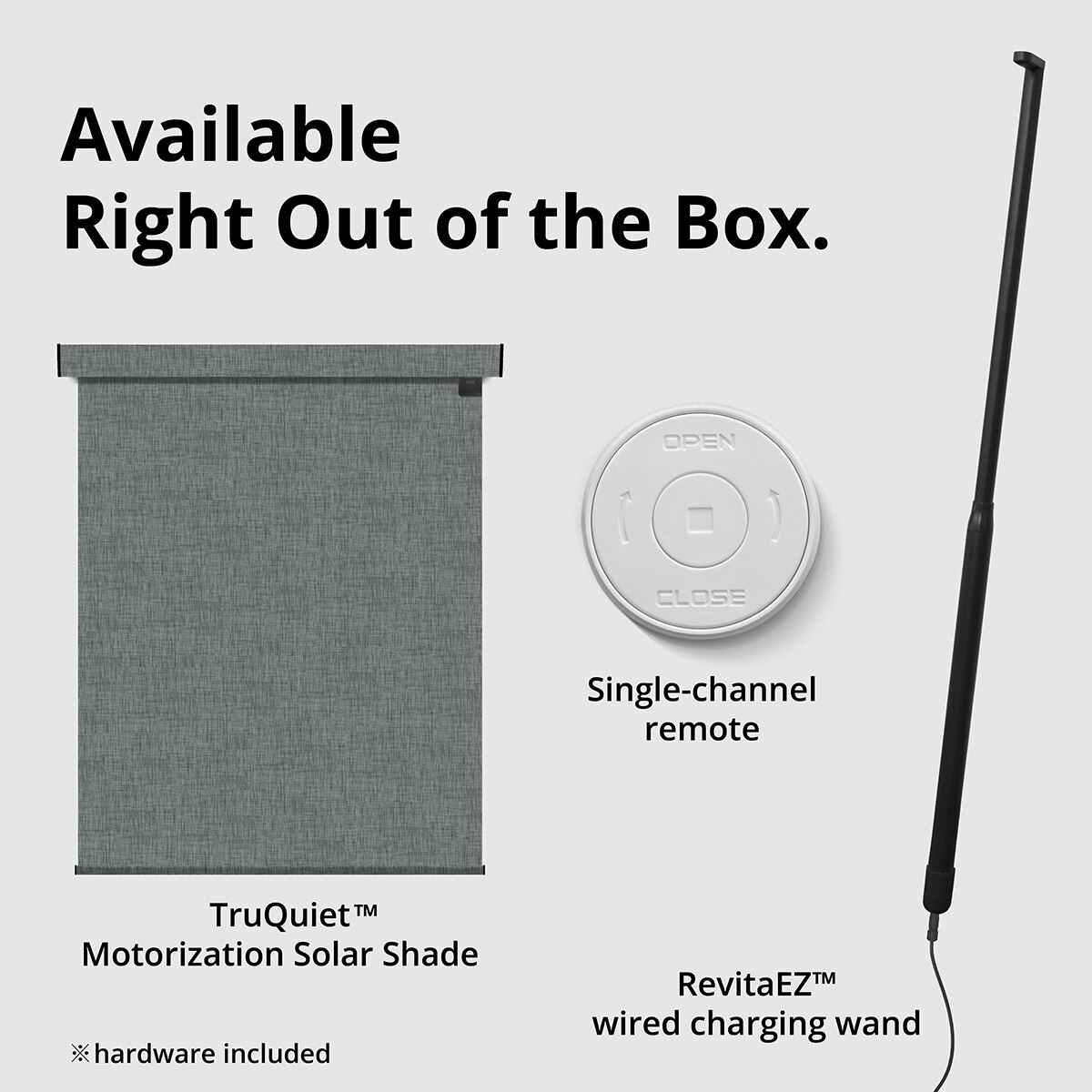 TruQuiet™ smart home battery motorized Solar shades with RevitaEZ™ charger for windows deliver clean, modern style with smooth, reliable performance powered by the TruQuiet™ Motor. (remote and wired charger included)